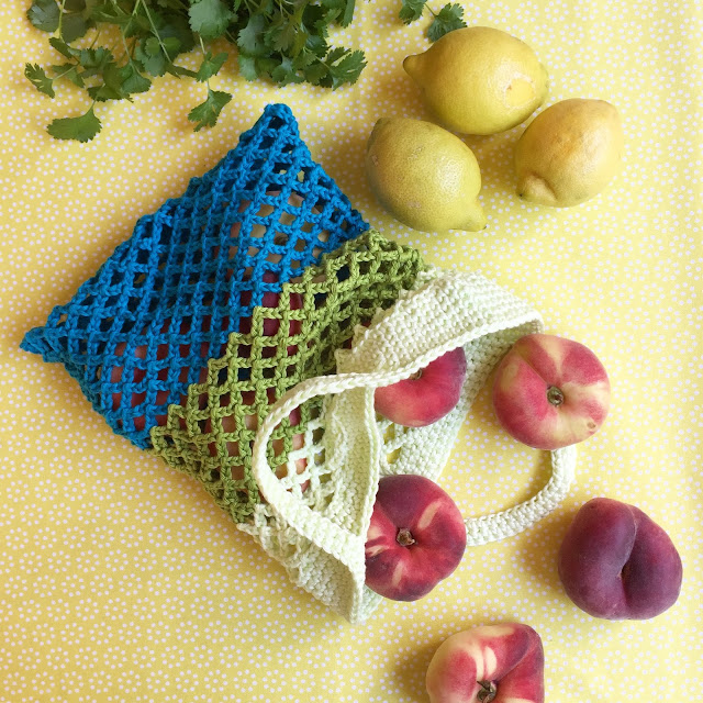 Man kann die bunten Einkaufsnetze wunderbar statt Plastik- oder Papiertüten nehmen. Recht schnell gehäkelt, nur mit einfachsten Maschenarten, im Garten unterm Apfelbaum oder abends sonnenmüde auf dem Sofa.